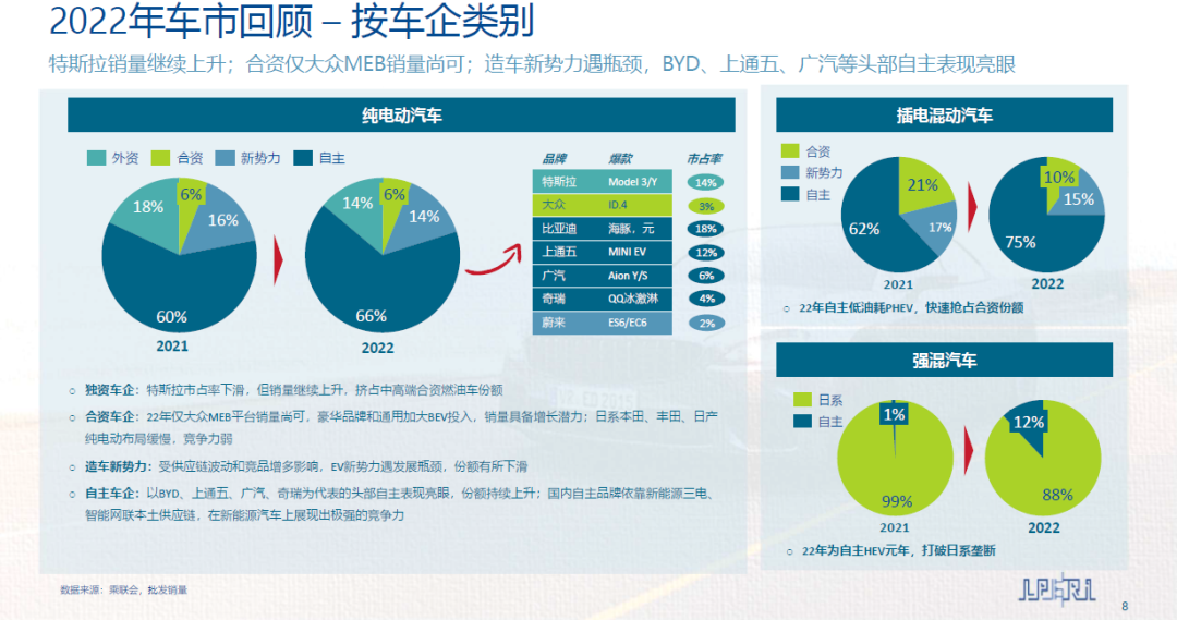 從BEV銷量來看,以特斯拉為代表的獨資車企雖然市場占有率下滑,但銷量繼續上升。合資車企中僅大眾MEB平臺銷量尚可。造車新勢力受到供應鏈波動和競品增多影響,遭遇發展瓶頸,份額有所下滑。以BYD、上通五、廣汽、奇瑞為代表的頭部自主品牌表現亮眼,份額持續上升。同時,自主品牌的低油耗PHEV新車型,搶占合資份額;另外,紛紛推出HEV車型,打破日系品牌的市場壟斷。