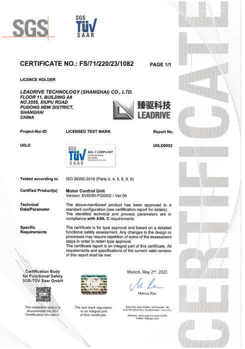 近日,國際權(quán)威第三方審核認(rèn)證機(jī)構(gòu)SGS為臻驅(qū)科技(上海)有限公司(以下簡(jiǎn)稱“臻驅(qū)科技”)頒發(fā)ISO 26262:2018 ASIL C汽車功能安全產(chǎn)品認(rèn)證證書,該證書是臻驅(qū)科技獲得的首個(gè)功能安全產(chǎn)品認(rèn)證證書,也是繼2021年7月獲得“ISO 26262:2018 ASIL D汽車功能安全流程認(rèn)證證書”后,在汽車功能安全產(chǎn)品開發(fā)能力建設(shè)的又一重大里程碑。