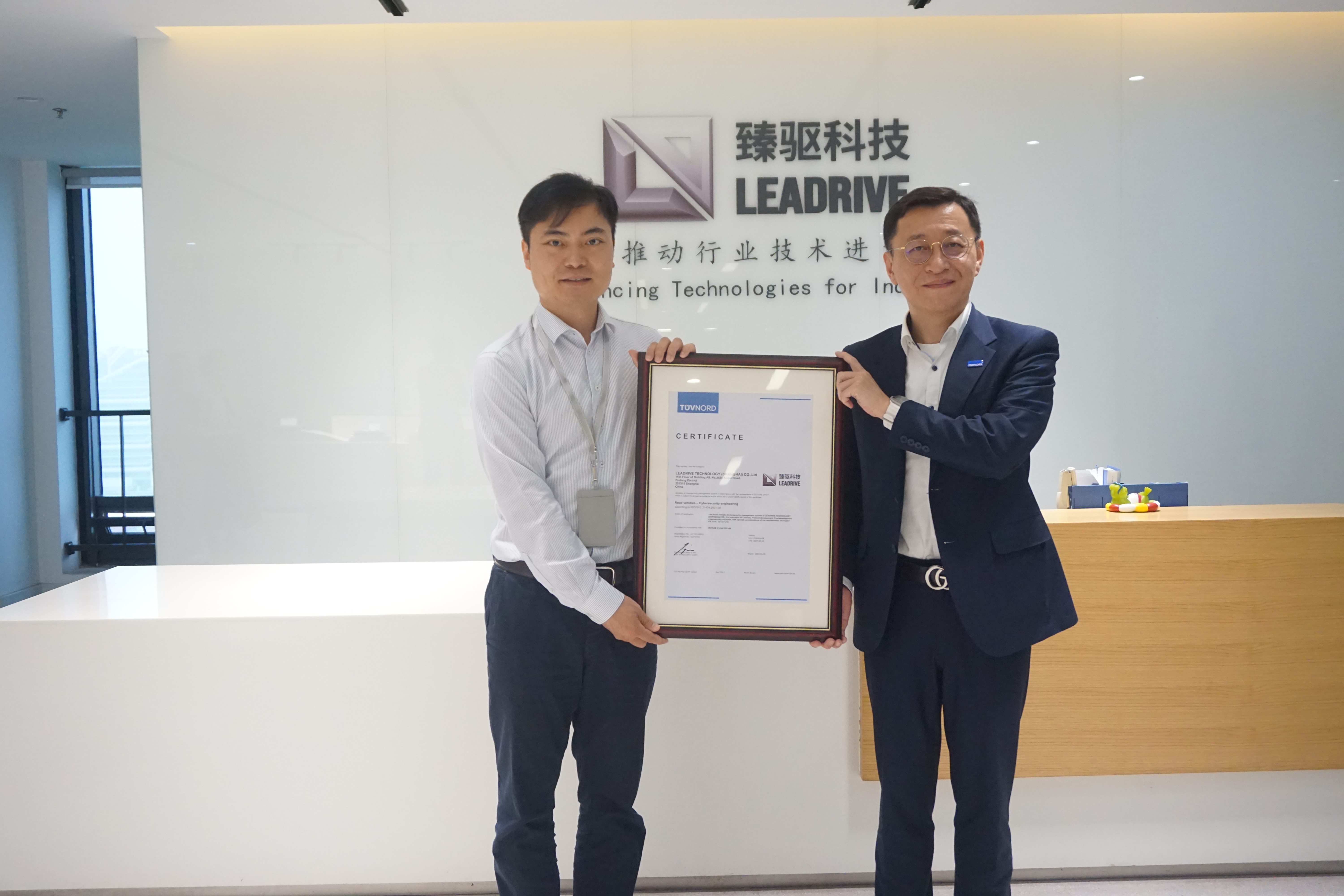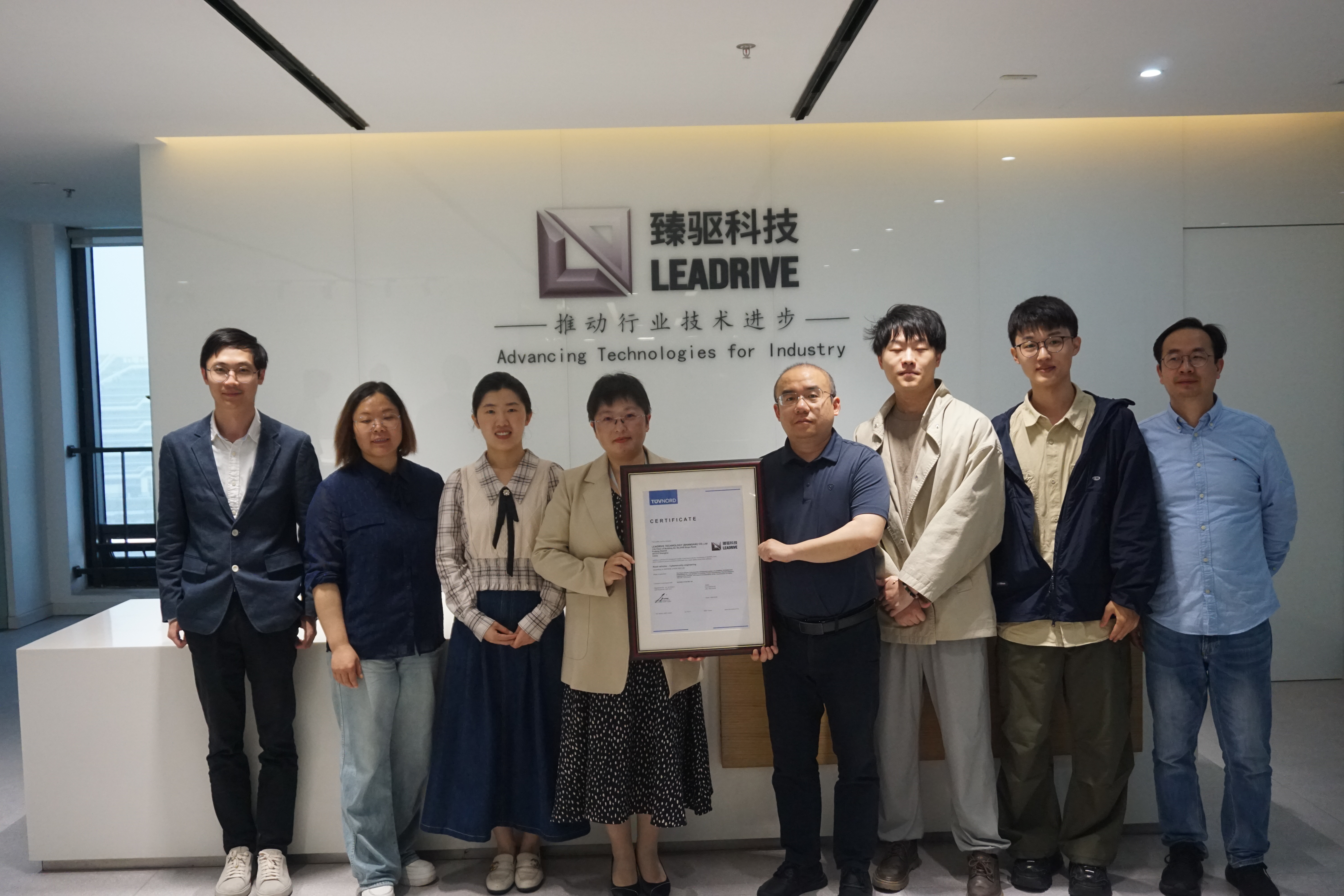 現(xiàn)場,臻驅科技副總經(jīng)理沈皓舜,臻驅科技首席工程師余浩,基礎軟件部研發(fā)經(jīng)理孫利干,TÜV NORD大中華區(qū)副總裁宋海寧及TÜV NORD中國區(qū)銷售總監(jiān)謝堯等雙方代表出席授證儀式。